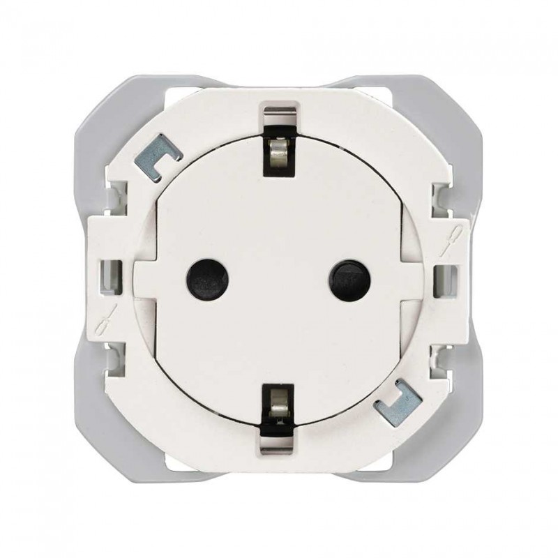 Base de enchufe Schuko en acabado blanco, equipada con sistema de conexión por clema para un montaje rápido y seguro. Diseñada para garantizar una conexión fiable y duradera en instalaciones eléctricas residenciales y comerciales. Compatible con enchufes estándar Schuko, ofrece facilidad de instalación y mantenimiento, manteniendo un acabado limpio y funcional.