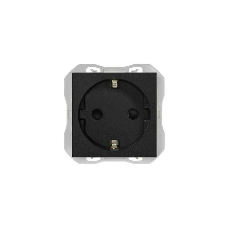 Base de enchufe Schuko de la serie SIMON 270, en acabado negro mate, que combina elegancia y funcionalidad. Cuenta con embornamiento por tornillo para una conexión segura y duradera de los conductores eléctricos. Ideal para instalaciones residenciales y comerciales que buscan resistencia y un acabado moderno. Su diseño facilita una instalación sencilla y mantenimiento eficiente, manteniendo la calidad y estética característica de la serie SIMON 270.
