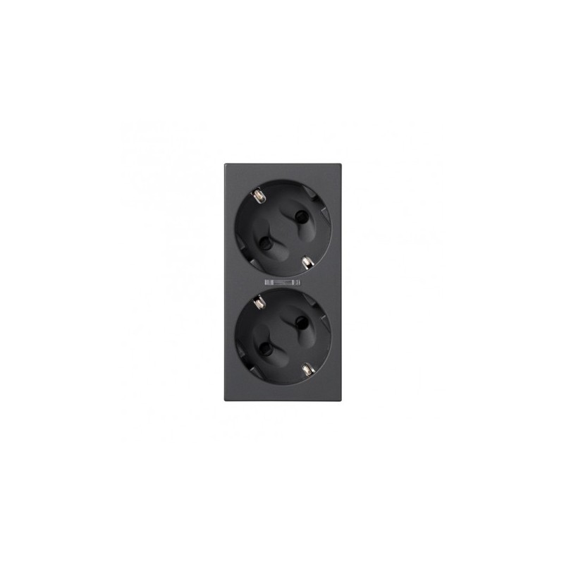Base doble tipo Schuko con indicador LED que facilita la identificación del estado de alimentación. Soporta hasta 16?A y 250?V, ofreciendo una conexión segura y fiable en instalaciones empotradas o sobre superficies planas. Su acabado grafito permite diferenciar visualmente circuitos o usos específicos, manteniendo durabilidad y seguridad en entornos residenciales, comerciales o profesionales.