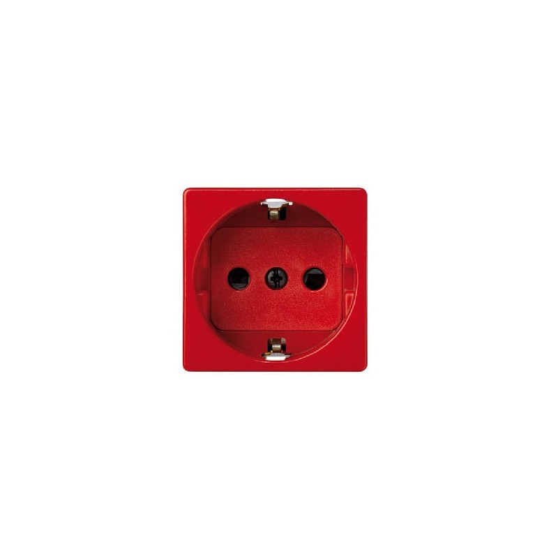 Base de enchufe tipo Schuko (2P+T) en color rojo, perteneciente a la serie Simon 27. Diseñada para instalaciones empotradas, ofrece una conexión segura y resistente, ideal tanto para entornos residenciales como profesionales donde se requiera una identificación visual rápida, como en circuitos dedicados o zonas técnicas. Fabricada con materiales de alta calidad, garantiza durabilidad, fiabilidad y compatibilidad con marcos y bastidores de la misma gama.