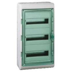 Cofret de la gama Kaedra con capacidad para 54 módulos distribuidos en 3 filas, con grado de protección IP65. Su diseño estanco y robusto garantiza resistencia frente a polvo, humedad y salpicaduras, ofreciendo seguridad y fiabilidad en entornos exigentes. Ideal para instalaciones eléctricas exteriores e industriales donde se requiere máxima protección y durabilidad.
