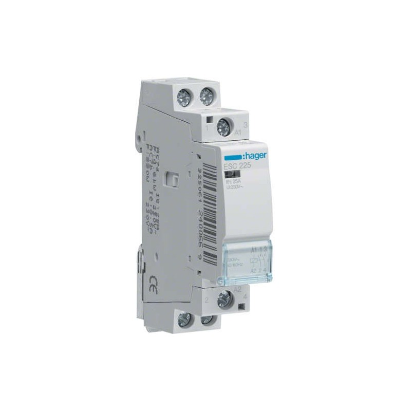Contactor Hager HAGESC225, 25?A, 2NA, 240?V. Diseñado para controlar y proteger circuitos eléctricos, permitiendo el accionamiento de cargas de manera fiable y segura. Su formato compacto facilita la instalación en carril DIN, adecuado para aplicaciones residenciales, terciarias e industriales.