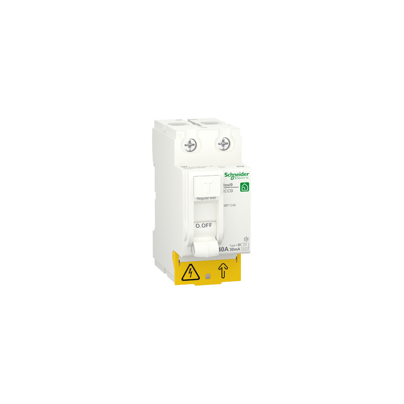 Interruptor diferencial Schneider Electric SCHR9R51240 de la gama Resi9. Ofrece 2 polos, una corriente nominal de 40A y una sensibilidad de 30mA en tipo AC, proporcionando protección eficaz contra fugas a tierra y contactos indirectos. Su diseño compacto permite una instalación sencilla en carril DIN, ideal para aplicaciones residenciales y cuadros eléctricos de uso general.