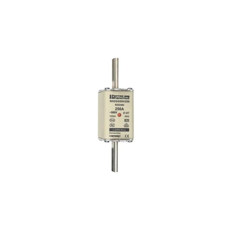 Fusible NH tamaño 2, 250A y 500V AC, categoría gG para protección general. Ofrece alta capacidad de corte, baja disipación térmica y gran fiabilidad frente a sobrecargas y cortocircuitos. Fabricado en cuerpo cerámico con contactos de cuchilla resistentes, cumple normativa DIN/IEC, garantizando seguridad y durabilidad en cuadros eléctricos, sistemas de distribución y aplicaciones industriales exigentes.
