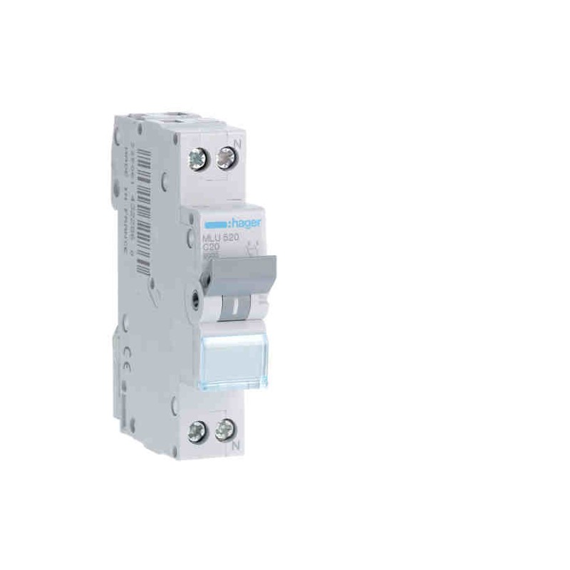 Interruptor automático Hager HAGMLU520, con configuración 1P+N y corriente nominal de 20A. Dispone de un poder de corte de 6kA y curva C, ofreciendo protección fiable frente a sobrecargas y cortocircuitos. Su diseño compacto de 1 módulo facilita la instalación en carril DIN, ideal para cuadros eléctricos residenciales y terciarios.