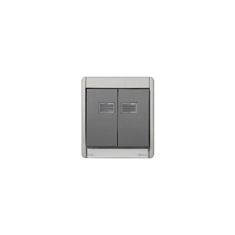 Marco con tecla doble integrada, en color gris, diseñado para aplicaciones eléctricas en entornos exigentes. Ideal para instalaciones en exteriores o zonas con humedad, ofrece un funcionamiento fiable y un diseño robusto. Compatible con cajas estancas, proporciona una solución duradera y segura para el control de dos circuitos desde un mismo punto.