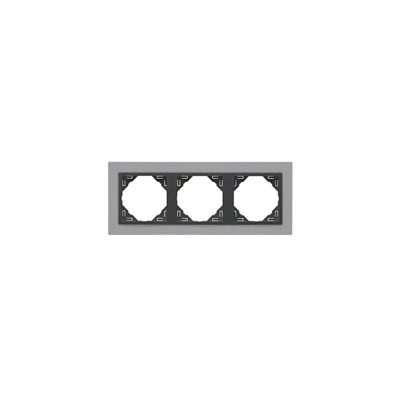 Marco triple con acabado en aluminio y gris, perteneciente a la gama Logus Animato. Su diseño bicolor ofrece un equilibrio entre modernidad y sofisticación, ideal para espacios que buscan un estilo técnico y contemporáneo sin perder elegancia. Compatible con tres mecanismos modulares.
