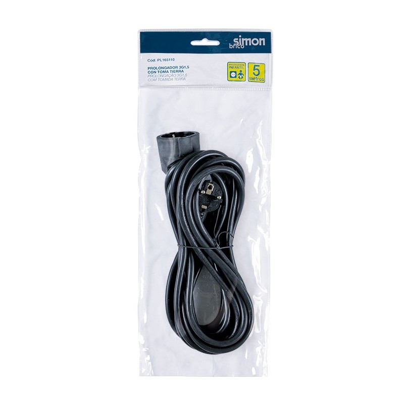 Prolongador SIMPL165110 de 5 metros, cable 3G 1,5 mm², color negro. Permite extender la conexión eléctrica de manera segura y fiable, ideal para uso doméstico o profesional. Su construcción resistente garantiza durabilidad, protección y comodidad en cualquier instalación.