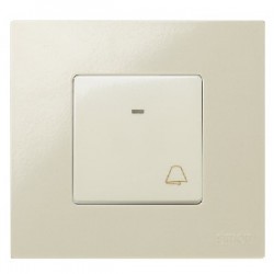 Pulsador de módulo ancho en color marfil, equipado con símbolo de campana y luz indicadora para facilitar su uso y localización en ambientes con poca luz. Ideal para sistemas de llamada o timbre, combina diseño ergonómico y funcionalidad. Soporta hasta 10A y 250V, fabricado con materiales duraderos y compatible con la serie Simon 27.