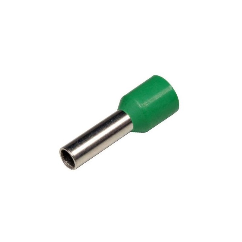 Puntera hueca corta en cobre electrolítico estañado, con aislamiento en polipropileno verde que identifica la sección de 6 mm². Garantiza una conexión segura y duradera en conductores flexibles, evitando el deshilachado de hilos y proporcionando máxima fiabilidad en regletas y bornes de presión.