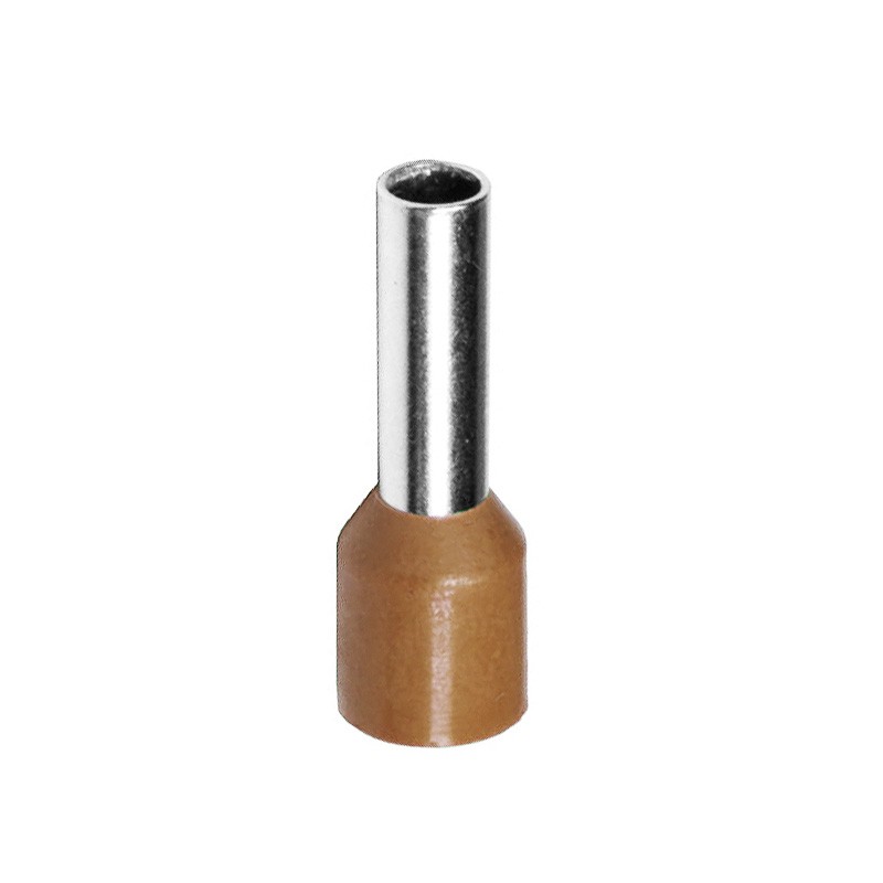 Puntera hueca corta en cobre electrolítico estañado, con aislamiento en polipropileno marrón que identifica la sección de 10 mm². Asegura una conexión firme y duradera en conductores flexibles, evitando el deshilachado de hilos y ofreciendo máxima fiabilidad en regletas y bornes de presión.