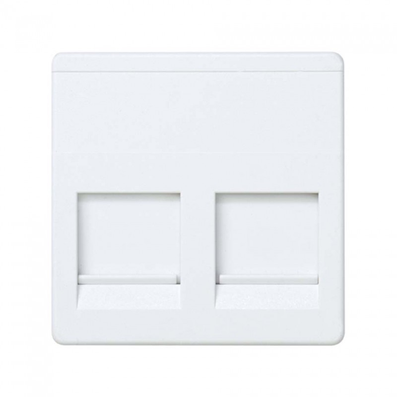 Tapa para dos tomas informáticas RJ45, en color blanco, ideal para instalaciones de red en entornos residenciales o profesionales. Ofrece una solución estética y funcional para cubrir puntos dobles de conexión, garantizando un acabado limpio, seguro y duradero. Compatible con mecanismos RJ45 estándar.