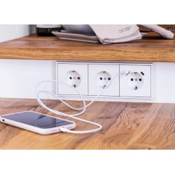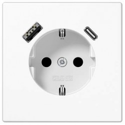 La JUGLS152015CAWW es una base de enchufe empotrable 2P+TT con doble salida USB (Tipo A y Tipo C) integrada, ideal para cargar dispositivos móviles directamente, sin necesidad de adaptadores. Con un diseño elegante en blanco alpino, es compatible con la serie LS990 de JUNG, ofreciendo funcionalidad moderna y estética uniforme en cualquier espacio.