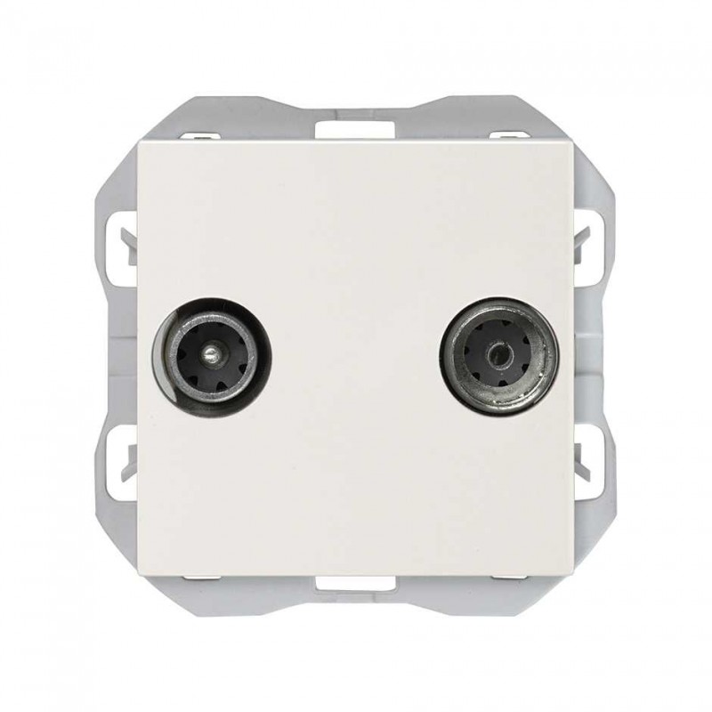 Toma combinada para señales de radio, televisión y satélite en acabado blanco, diseñada para instalaciones de distribución de antena intermedia. Permite una conexión eficiente y fiable de equipos receptores, garantizando una señal de alta calidad. Fabricada con materiales duraderos, ofrece una instalación sencilla y una integración estética en entornos residenciales y comerciales.