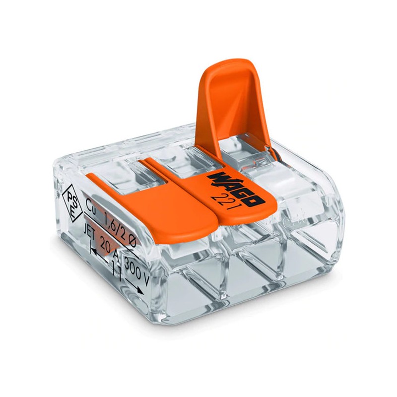 Conector Wago 221 413, compatible con cables de hasta 4 mm², que permite conexiones rápidas, seguras y fiables sin necesidad de herramientas adicionales. Su diseño compacto facilita el montaje y mantenimiento, mientras que la carcasa transparente permite verificar visualmente la correcta conexión. Fabricado con materiales de alta calidad, asegura durabilidad, resistencia mecánica y seguridad eléctrica en instalaciones residenciales, comerciales e industriales.